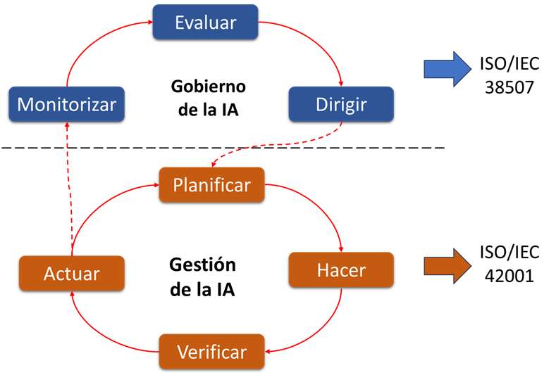 Como señalan Piattini y Fernández, el gobierno de la IA cae en el ámbito de la norma ISO/IEC 38507, mientras que la gestión de la IA lo hace en el de la ISO/IEC 42001, y además existen otras muchas normas relacionadas con calidad, seguridad, etc. tanto del modelo, como de los datos o el software de la IA.