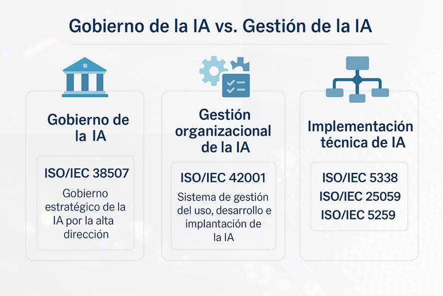 Por tanto, es importante deshacer la confusión que existe entre gestión y gobierno de la IA, de manera que la verdad, expresada con rigor profesional y basada en estándares internacionales es que: