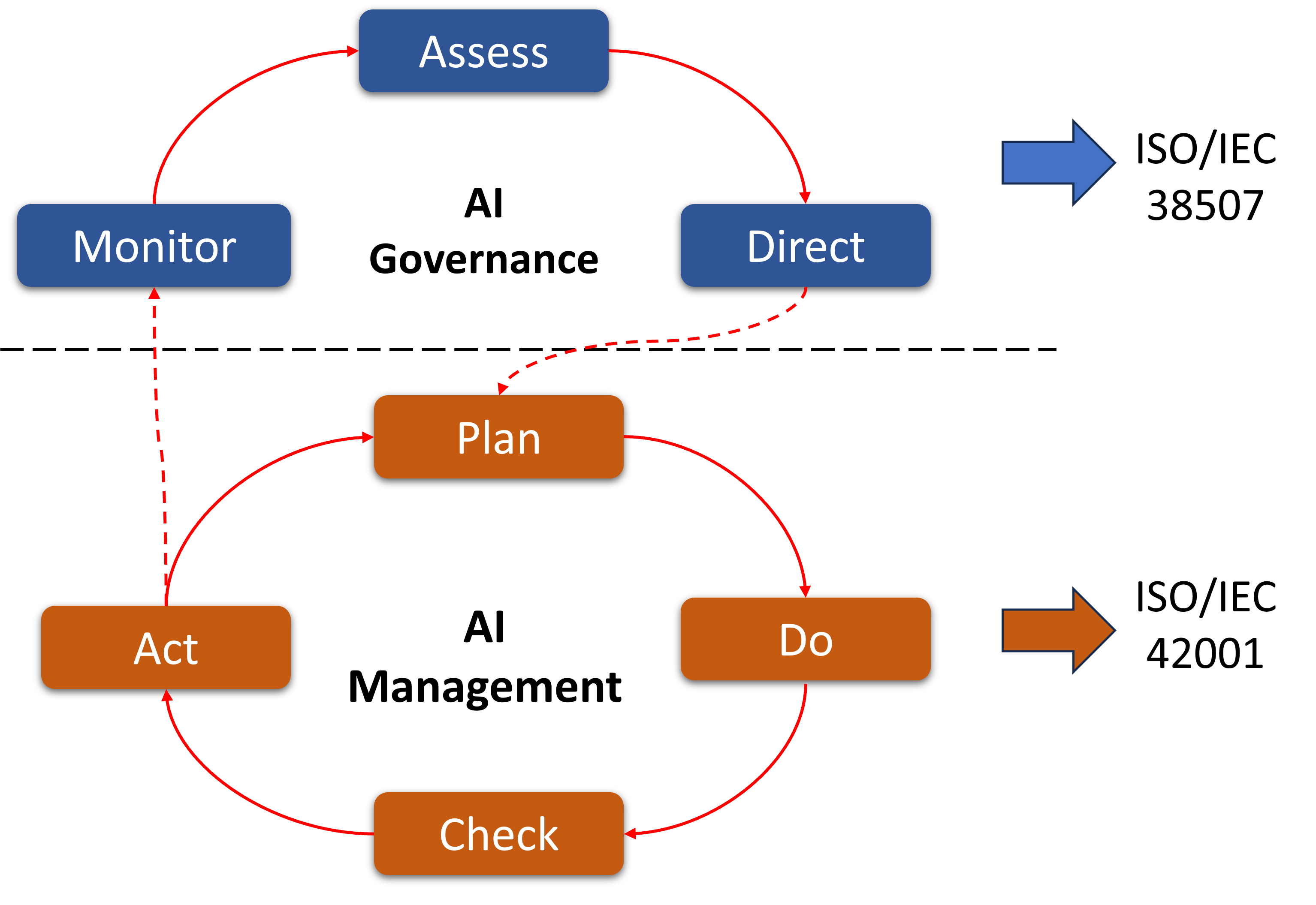 As Piattini and Fernández point out, AI governance falls within the scope of ISO/IEC 38507, while AI management falls within the scope of ISO/IEC 42001. There are also many other standards related to quality, security, etc., covering both the model and the data or software used in AI.
